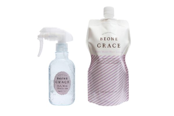 パーマ施術のうえで、2剤の代わりに使用するビーワンの原水をベースにした化粧水。ロットパーマ、アイロンパーマ、ストレートを問わず、従来のプロセスに比べて薬剤を大幅に減らすことが可能になりました。